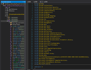 The memory section is dumped to disk and the resulting file – the AgentTesla stealer – is opened in a new dnSpy session. While still a little obfuscated, the source is relatively easy to read through: